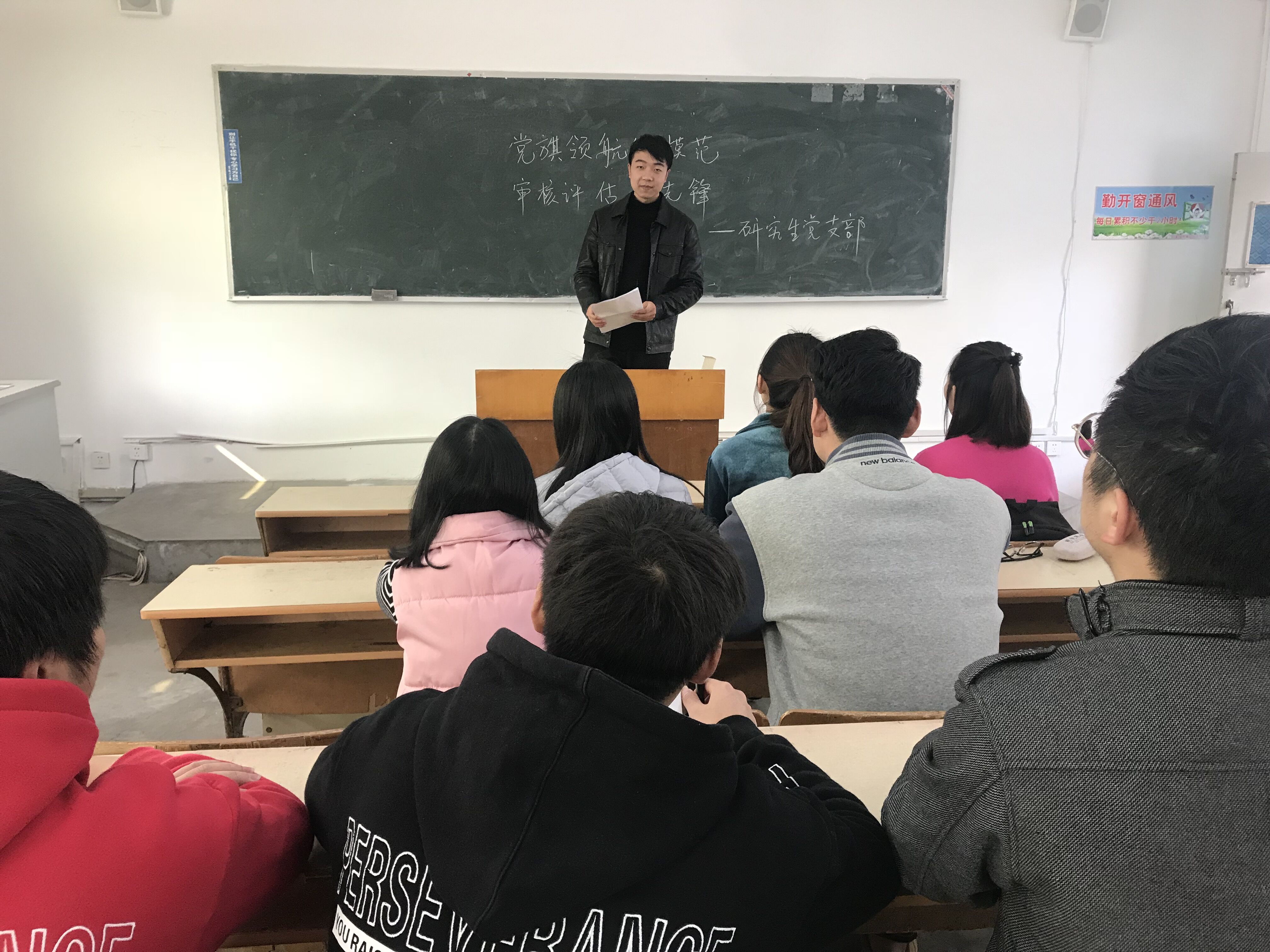 为迎接我校本科教学工作审核评估,助力学校评估工作的顺利进行,进一步发挥基层党组织的凝聚力、战斗力和党员的引领示范作用,1127日下午2:00,管理工程学院研究生党支部在2208教室集中召开了以“党旗领航做模范,审核评估当先锋”为主题的党日活动,研究生支部全体党员参加了此活动。