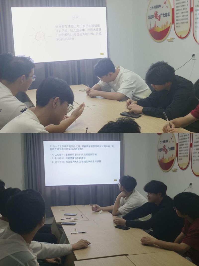 环节一“心情盲盒”中,参与者匿名写下近期烦恼或喜悦,投入特制信箱。一名大一学生写道:“学习压力让我失眠,但室友的陪伴让我感到温暖。”随后,大家随机抽取他人便签,以匿名回信传递善意。一名匿名同学在回信中写道:“你的努力终会开花,别忘了身边永远有支持你的人!”字句间流淌的共情令现场暖意融融。环节二“心理知识竞答”将科普融入趣味互动,题目涵盖情绪管理、压力应对等主题。例如“如何缓解焦虑情绪?”的抢答中,参与者不仅准确答出“深呼吸、运动、倾诉”等答案,还结合自身经历分享实用技巧。环节三“情绪释放站”将活动推向高潮。同学们将负面情绪书写于纸上,通过撕碎、揉团等方式进行“仪式化告别”。一名参与者感慨道:“当纸片被撕开的那一刻,仿佛烦恼也随之消散,这种释放感太治愈了!”