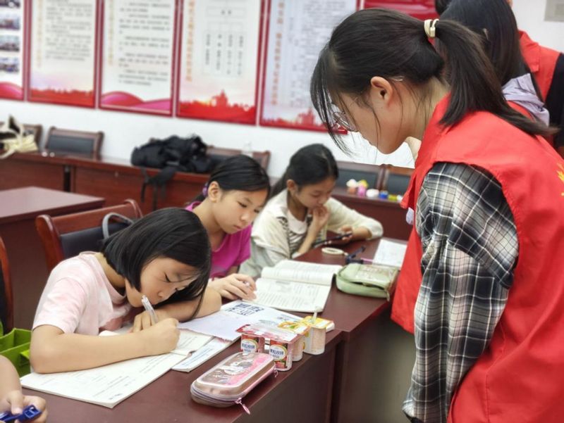 此外,志愿者们还专门安排时间辅导小朋友写作业。活动室内,孩子们拿出暑假作业,志愿者们分组耐心地为他们答疑解惑,从数学题的解题思路到语文课文的理解,细致入微的讲解让孩子们茅塞顿开。遇到难题时,志愿者们会用有趣的例子引导孩子思考,氛围轻松又高效,不少孩子表示:“志愿者哥哥姐姐讲题比我自己琢磨容易多啦!”