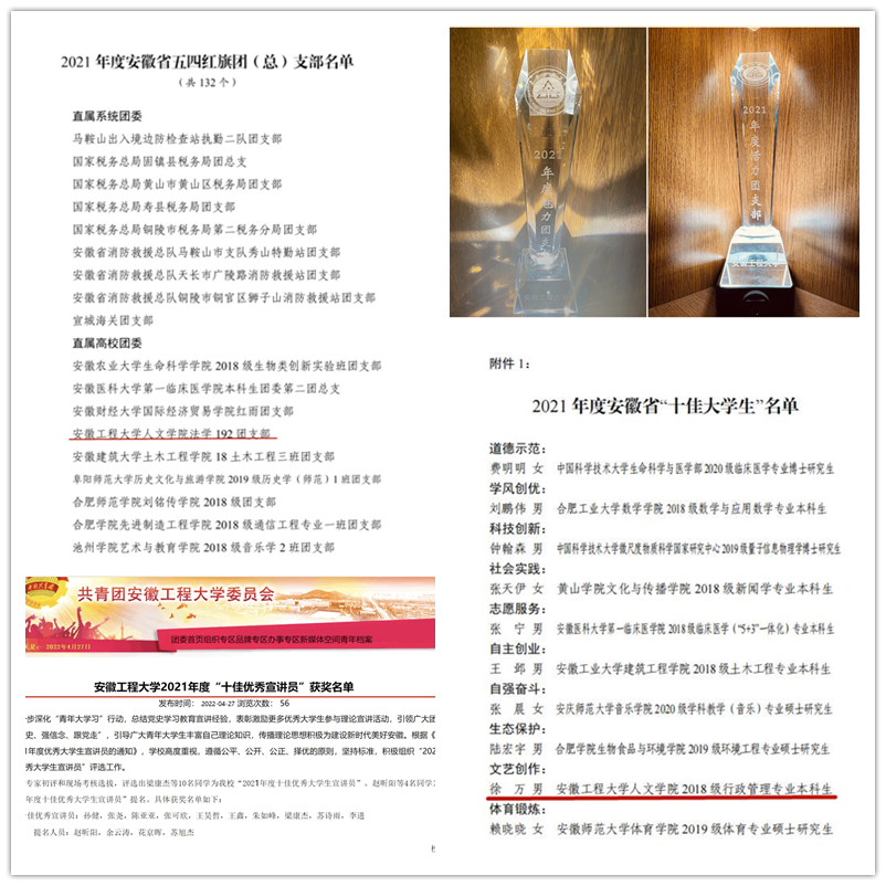 五月的火炬燃烧青春激情的梦想,五月的花海浸透青年奋斗的汗水。在庆祝中国共青团成立100周年之际,人文青年学子以优异成绩向五四青年节献礼。在安徽省和学校近期开展的各类评奖推优活动中,经过层层选拔,人文学子不负众望,凭借优良的品质与杰出的表现斩获佳绩!行管182班徐万同学荣获“安徽省十佳大学生”称号,法学192班团支部获“安徽省五四红旗团支部”;法学201班团支部获“校活力团支部”,行管192班程路程同学和法学192班夏辉同学获“校十佳大学生”,法学201班孙健同学和法学192班夏辉同学获“校魅力团支书”,法学201班孙健同学、张尧同学获“校十佳优秀宣讲员”。