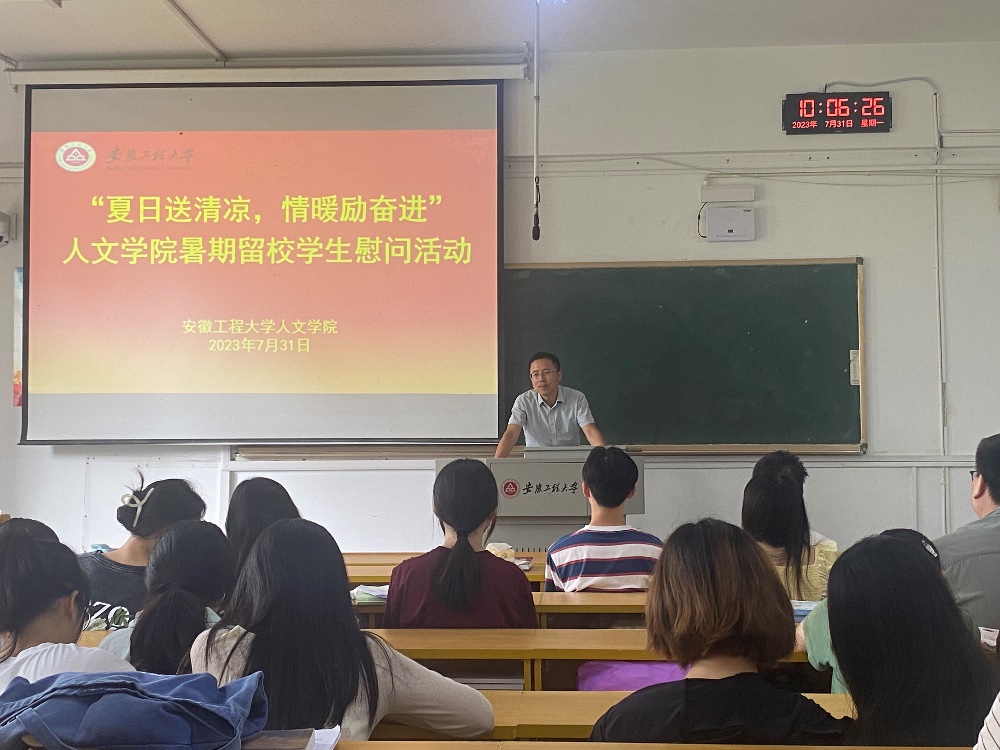 为进一步落实学校《关于加强暑期留校学生教育管理的通知》要求,推深做实“三全六专”育人实践,切实把对留校学生的人文关怀落实做细,7月31日,人文学院在4J108举办“夏日送清凉,情暖励奋进”暑期留校学生慰问活动。学院党委副书记王中江,辅导员代表章雪平,全体暑期留校本科生和研究生参加了本次活动。活动由学院团委副书记利昕云主持。