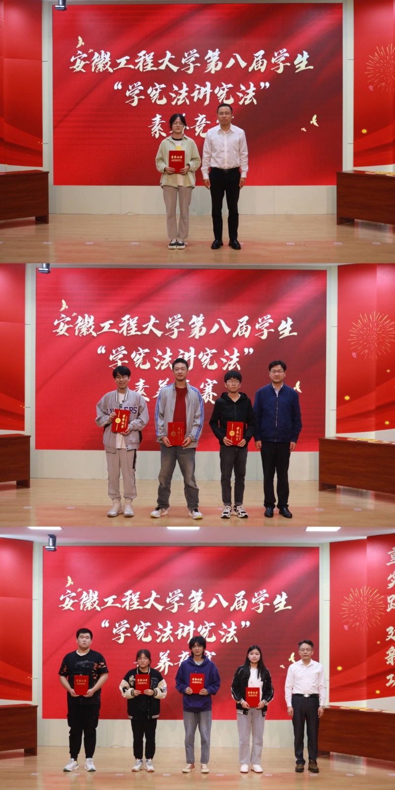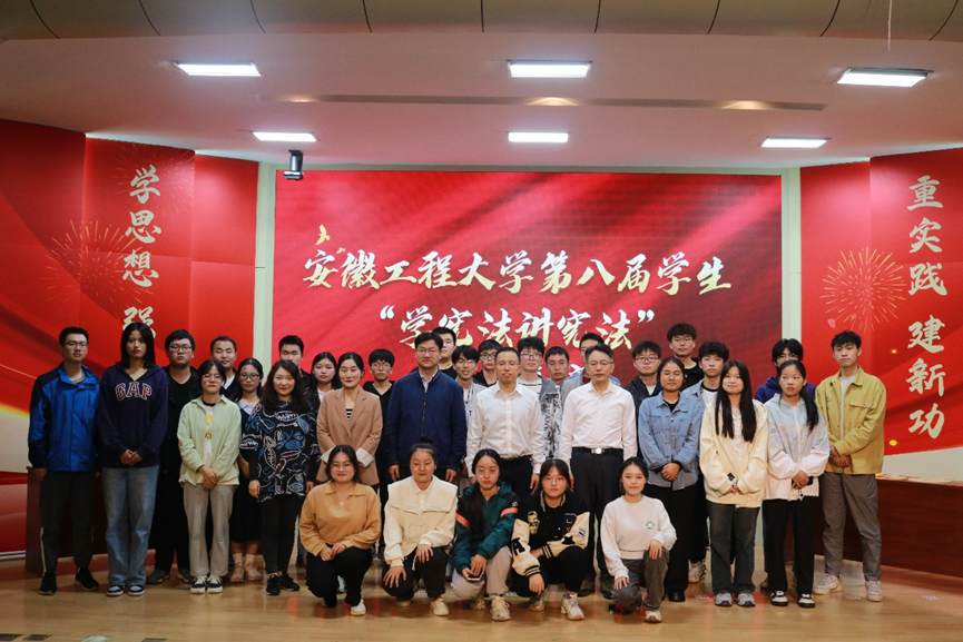 经过激烈角逐,经济与管理学院“知法学法不犯法队”荣获一等奖,人文学院“争锋相队”、电气工程学院“你说的都队”、机械工程学院“下岗职工再就业队”等3支队伍荣获二等奖,数理与金融学院“法力无边队”、化学与环境工程学院“勇敢向前冲队”、设计学院“无所不队”、生物与食品工程学院“学宪法小分队”等4支队伍荣获三等奖。最后,嘉宾与获奖代表合影留念,本次活动圆满落幕。