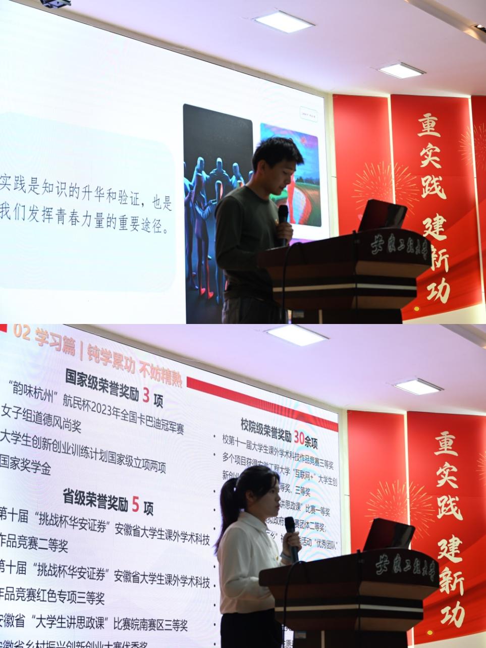 最后,优秀团员青年代表开展先进事迹宣讲活动。法学222孙中乐进行《青春力量,在“知”在“行”》主题宣讲,结合自身参军入伍经历,建议新生注重知行合一,在学习中成长,在实践中探索真理。行管212陈轶嘉进行《踔厉奋发担使命,赓续前行向未来》主题宣讲,结合自身在校学习获奖情况、参加社会实践经历、担任团干部经历,激励新生奋发学习、增长才干、创造美好未来。