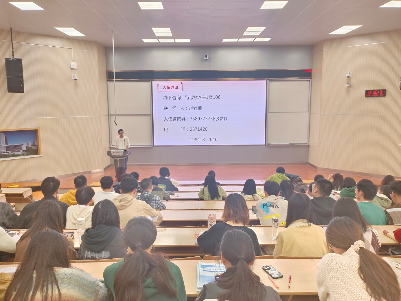 会上,赵成婧围绕大学生征兵的政策、应征入伍条件、报名流程、注意事项、参军入伍优势、职业发展、优抚优待、就业升学等方面进行了全面分析和解读。并重点讲述了退伍后的退役士兵考研、事业编、公务员、部队文职等专项计划等同学们关注的相关问题。她表示,参军入伍是每个公民应尽的光荣义务,希望能有更多的同学将个人理想与国家命运紧密相连,积极投身热血军营。