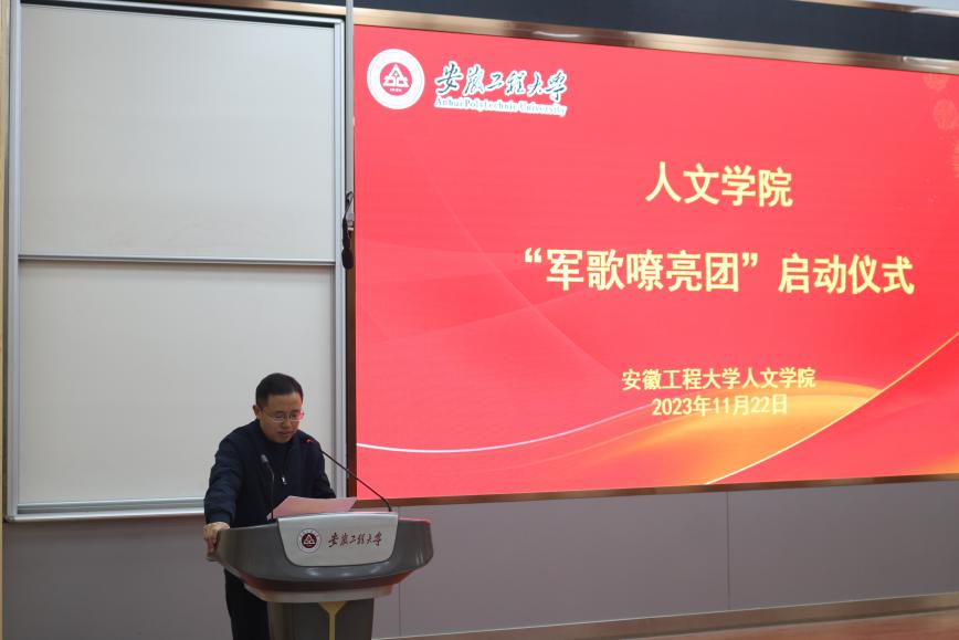 活动在庄严的国歌声中拉开序幕,师生精神饱满,壮怀激昂。首先,利昕云宣读《人文学院“军歌嘹亮团”项目方案》,介绍了工作任务、内设机构、具体职责、组织保障,重点阐述了“军歌嘹亮团”的“9个1工作职责”。接着,王中江宣读“军歌嘹亮团”成员名单,并一一介绍成员的简要情况,鼓励退役复学大学生不负韶华,接续奋斗,努力实现从“国防卫士”向学校“发展生力军”的转变。