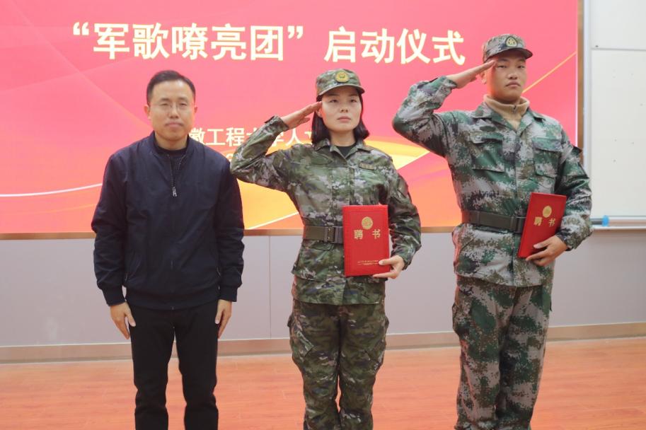 随后,刘一、王中江分别为“军歌嘹亮团”团长法学212贺行郑、副团长社工研23胡天麒、副团长行管(升)231郭威莉颁发聘书,并合影留念。团长法学212贺行郑作为“军歌嘹亮团”代表发言,他表示“军歌嘹亮团”将积极发挥退役大学生在“三全六专”工作中的引领示范作用,将部队优良作风传递给身边的同学,坚决树立起“退伍不褪色”的良好形象。