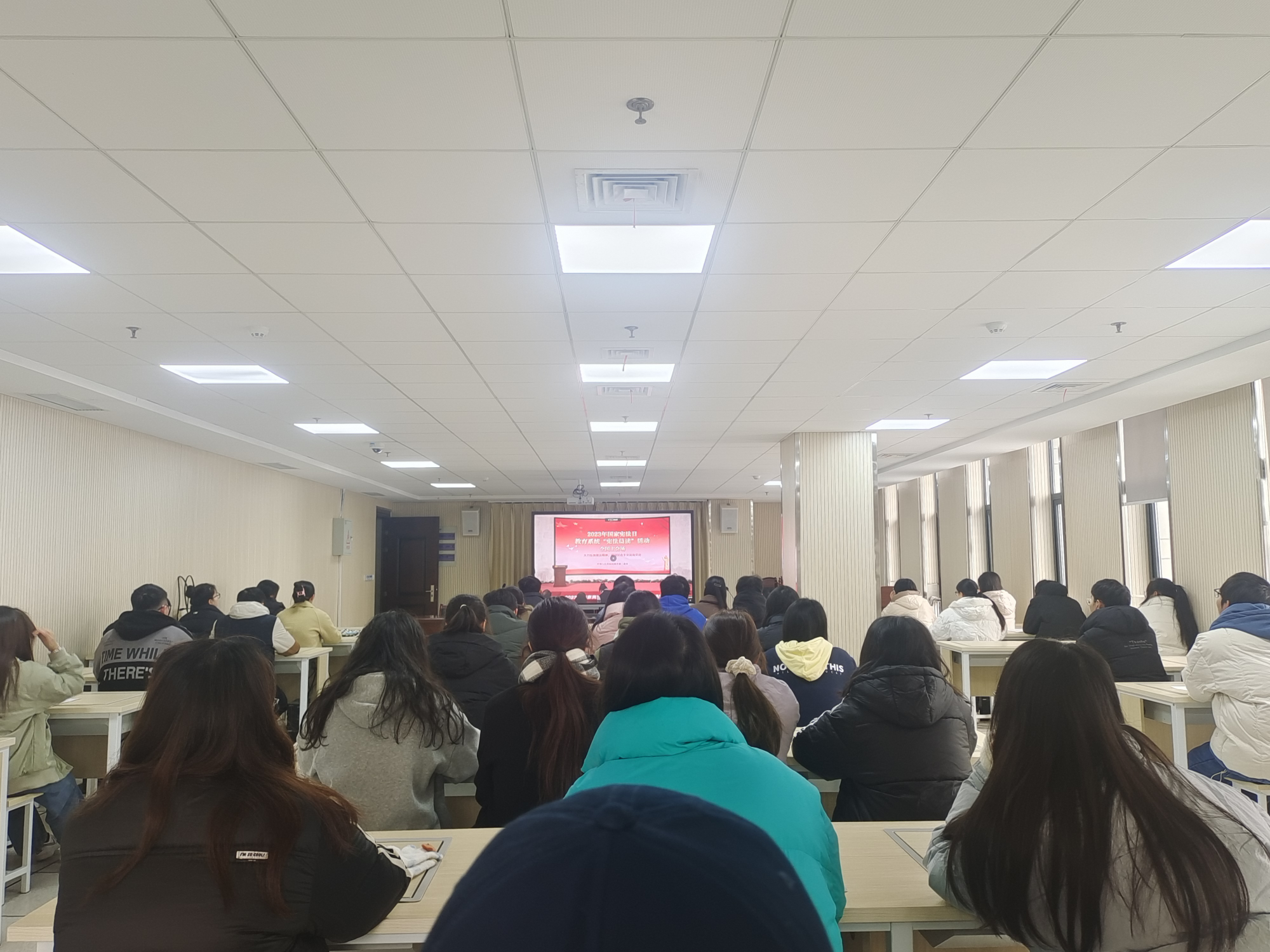 活动开始,全体同学起立,与主会场一起,奏唱中华人民共和国国歌。并在主会场领读人的带领下,同学们大声诵读《中华人民共和国宪法》,深刻领会宪法的庄严与神圣,使宪法“声”入人心。