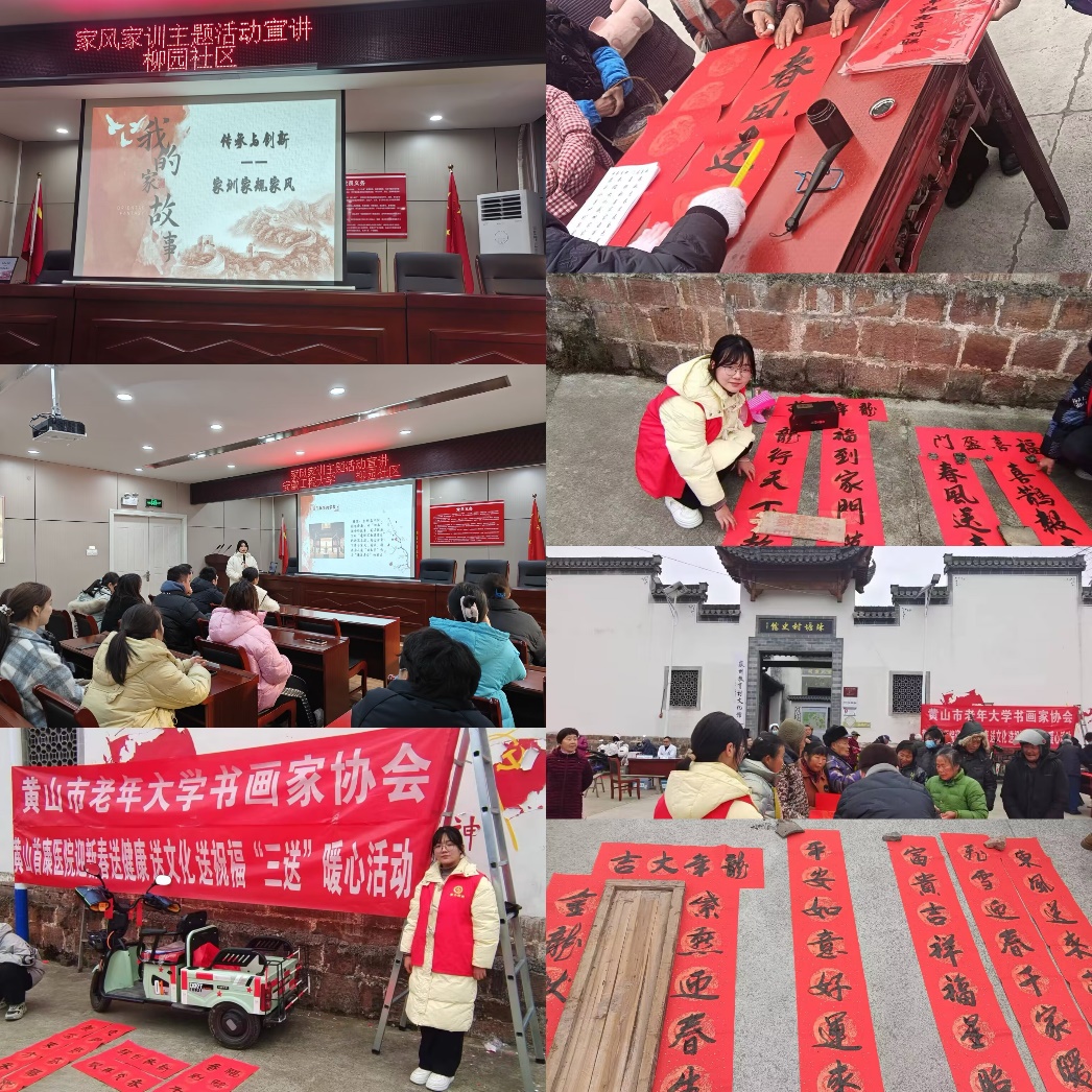 为引领青年学子积极参与家乡建设发展,125-26日,暖途青年志愿者服务社组织部分志愿者深入乡村、社区,开展生动活泼的实践活动。在铜陵市柳园社区,法学234刘文婷作为当地家风家训主题活动宣讲员代表,通过分享她的家庭故事、家庭生活中的感受等,展现出家乡的发展成就。在黄山市徽州区西溪南镇,志愿者们协助黄山市老年大学书画家协会的书法家们,开展写春联送祝福活动。电商法231吴燕萍分享了参加活动的感受,“研墨、铺纸、挥写、对齐、晾干,作为志愿者,我们将蕴含着书法家们辛勤汗水、美好祝愿的春联送到村民手中,并向村民送上节日的温暖祝福,不仅弘扬了中华优秀传统文化,更为即将到来的新春佳节营造了喜庆的氛围。现场领到春联的村民,脸上洋溢着灿烂的笑容,让这个春节更有意义,更有烟火气”。此外,志愿者们来到蚌埠市怀远县图书馆、阜阳市太和县科技馆、阜阳市太和华源医院等家乡当地的公共场所,多渠道力所能及地参与基层治理日常工作。